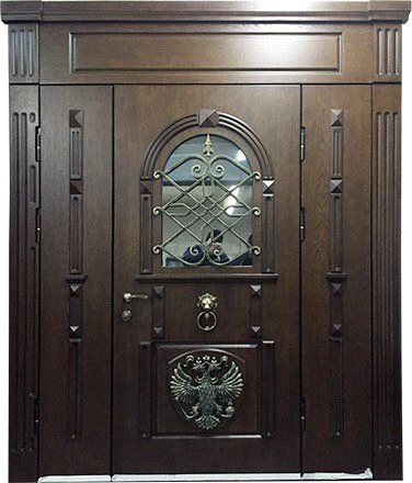 Поговорим об отделке. Вариантов декора дверей много. В большинстве случаев, для отделки элитных дверей используется массив натурального дерева или натуральный шпон с фрезеровкой. Цвет двери так же делается по желанию заказчика. Очень красиво и представительно выглядят двери с ковкой и стеклом.
