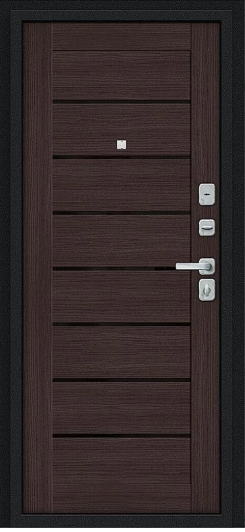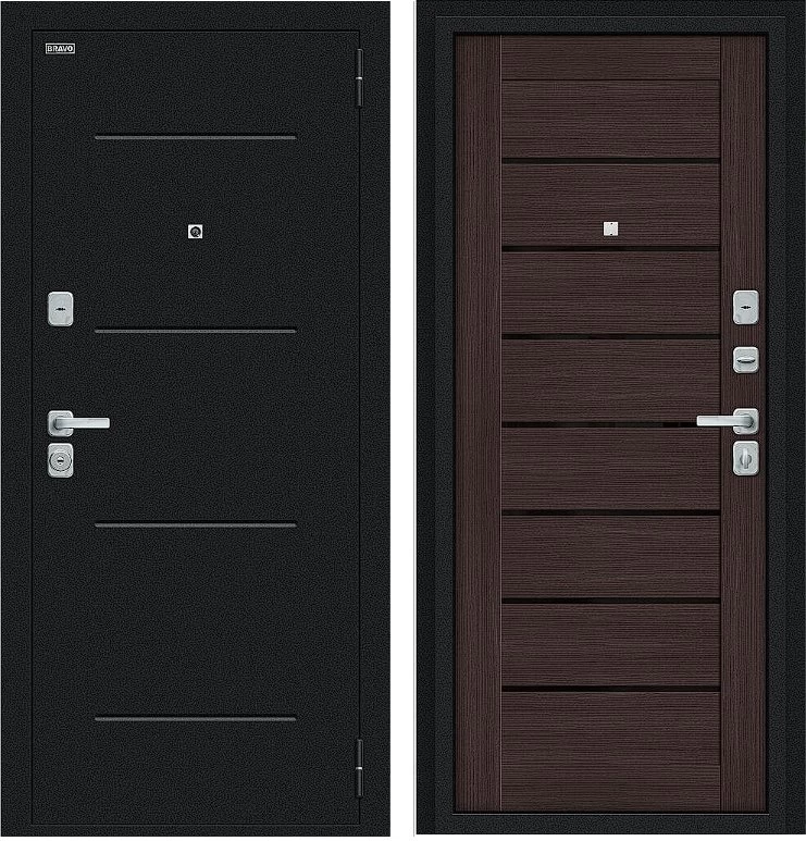 Надежная входная Дверь Браво Техно/BChrome Букле черное/Wenge Melinga премиум класса по цене 35 071 руб. Большая толщина стали защитит от проникновения в ваш дом, квартиру или коттедж. Используется очень качественная фурнитура: замки, цилиндры, ручки, защелки. Покрытие и отделка двери изготовлено под внимательным контролем производителя. Дверь имеет долгий срок службы и гарантию.